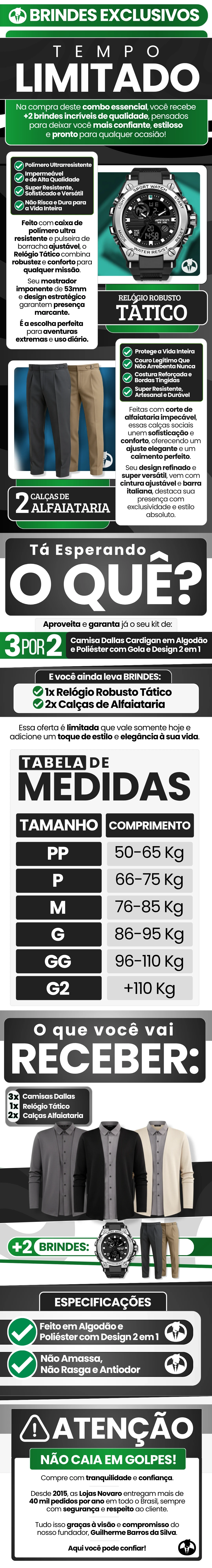 Pode lavar, usar e repetir sem medo: cardigan mantém a forma, não encolhe com frio nem calor. Feito pra rotina bruta de quem não arrega, do churrasco à reunião. Orgulho de vestir uma peça que vai longe e ainda vira referência.