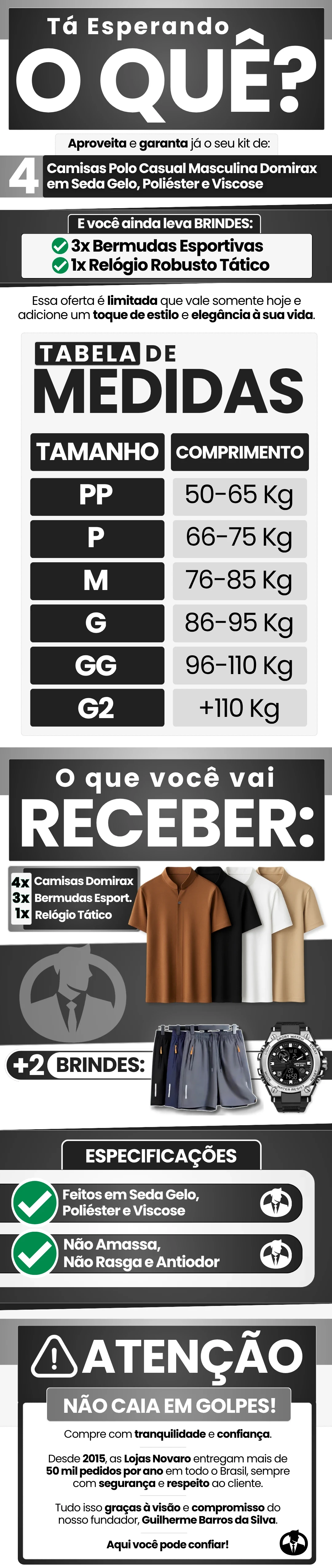 Essa peça não é para qualquer um. Feita para homens de presença que sabem o valor da elegância sem esforço. A produção é limitada e a demanda é alta. Se deixar para depois, pode ficar sem. Não perca tempo: vista-se como um líder e garanta a sua agora.