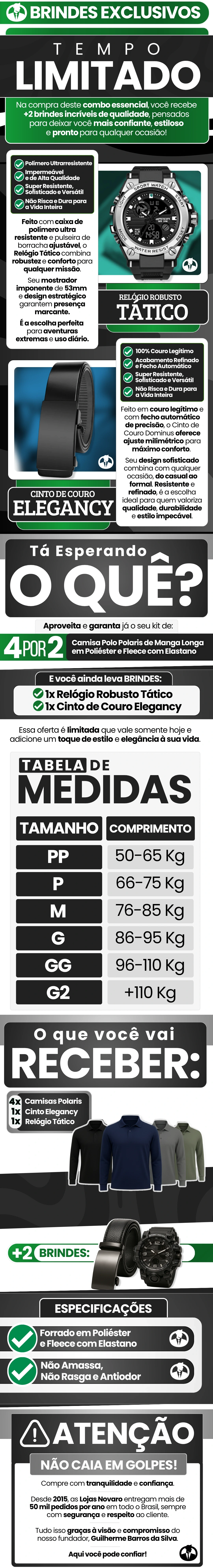 Esqueça as roupas que não aguentam seu ritmo. A Polaris da Novaro é construída com uma malha externa de poliéster e elastano, oferecendo resistência e elasticidade para o seu dia a dia intenso. Por dentro, o forro de fleece regula a temperatura do seu corpo, sendo a peça definitiva para quem exige qualidade e durabilidade acima de tudo. Esta camisa é uma afirmação da sua postura.