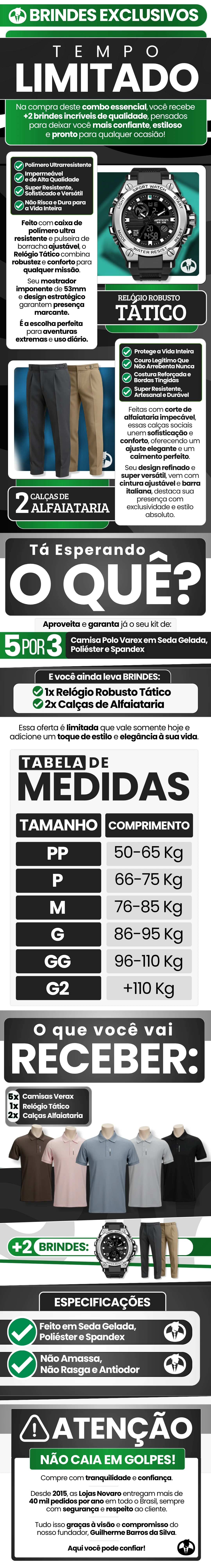 Nossa Camisa Polo Varex não é feita de material comum. A composição de Poliéster e Spandex cria uma Seda Gelada que é resistente como aço e macia ao toque. Ela foi projetada para o homem que enfrenta o dia a dia sem medo, exigindo uma peça que aguenta o tranco e mantém a postura de quem manda. Essa é a sua armadura para o cotidiano.